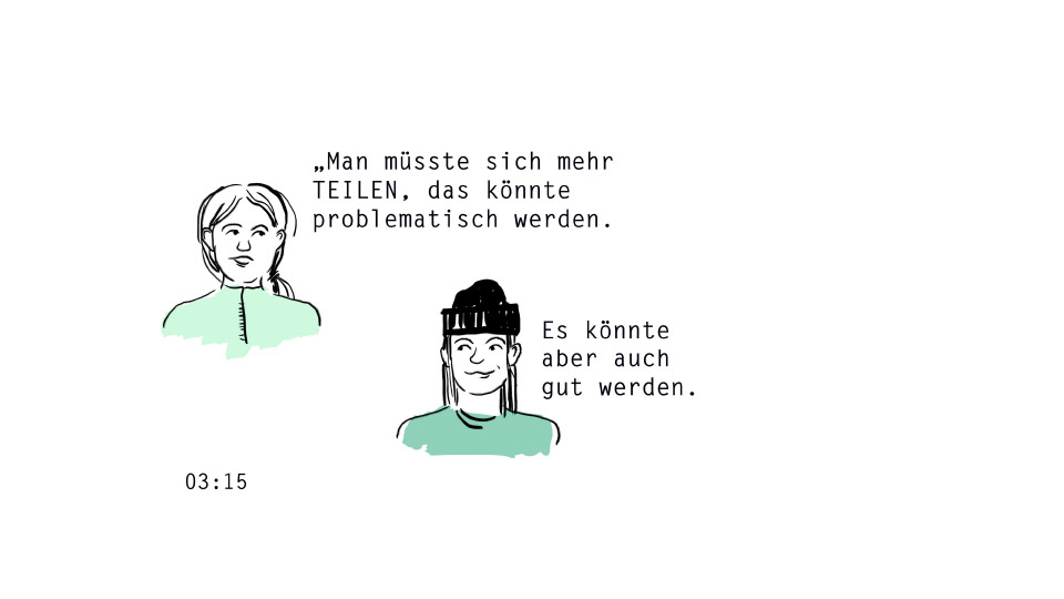 Während in der Halle debattiert wird, sitzen Kinder und Jugendliche der Genossenschaft mit Luc Ouali, Klimaaktivist und Demokratieverteidiger, zusammen. Sie entwerfen ihre eigene Vision vom Wohnen der Zukunft und präsentieren sie in Runde drei. Ihre Forderungen sind klar: mehr Teilen, weniger Besitzen, Mieten nach Leistungsfähigkeit, gemeinschaftlich Nutzen statt individueller Ansprüche. Keine Ideologie, sondern praktische Ideen von jenen, die noch lange mit den Folgen der aktuellenEntscheidungen werden leben müssen.